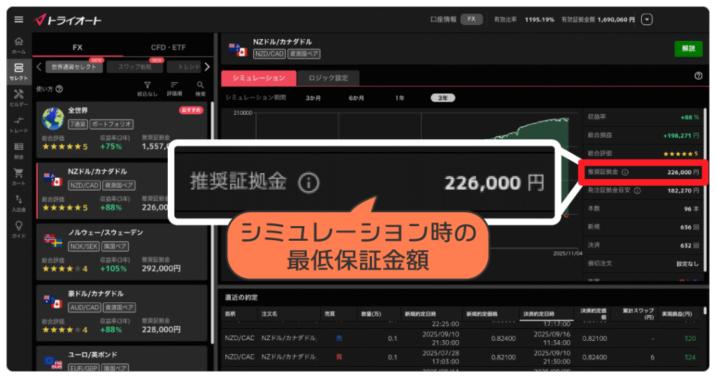 シミュレーションにはその自動売買の推奨証拠金が表示されています。推奨証拠金は、「その自動売買のポジションを保有するために必要な証拠金+当該通貨ペアの過去3年間における最大ドローダウン」で計算された、比較的安全な目安金額ということです。
