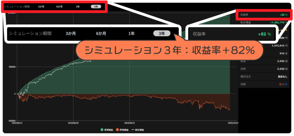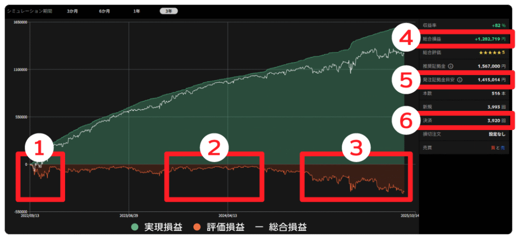 シミュレーション期間の損益です。このシミュレーションの場合、3年間で130万円近い総合損益となっています。ただし利益だけを見るのではなく、必要な証拠金とのバランスが重要です。