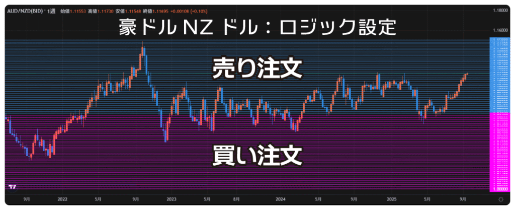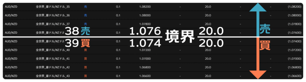 上の画像は、全世界に含まれる豪ドルNZドルの自動売買に入っている注文を、「ロジック設定」の項目で表示したものです。上半分の水色の線は売り注文、下半分のピンク色の線は買い注文です。