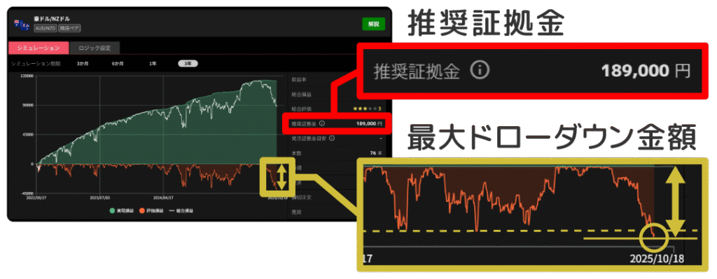 推奨証拠金とは、実際の取引に必要な金額(証拠金)と、シミュレーション上で資産が一番大きく減ったときの減少幅(最大ドローダウン金額)を表す金額です。