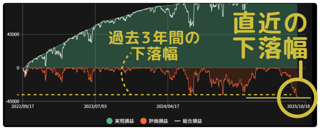 ここでは、直近のオレンジ色の評価損益が、過去3年間に作った下落幅(谷)より深くなっていることが分かります。これが最大ドローダウンの更新です。