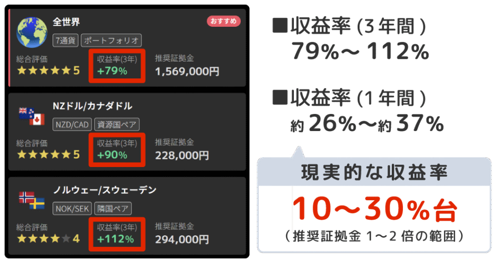 つまり、推奨証拠金の1〜2倍の範囲で、収益率は10〜30%台。
