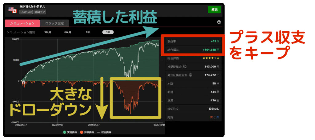 年単位で利益を蓄積していければ、シミュレーション期間の後半で発生したような大きなドローダウンがあっても、口座全体はプラス域を保つことができました。