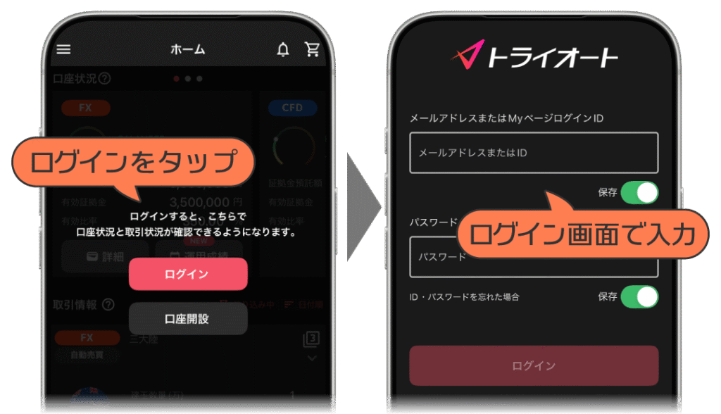 トライオートアプリを起動し、「IDまたはメールアドレス」と自分で設定した「Myページパスワード」を入力すると、取引画面が表示されます。ログインに5回以上失敗するとロックがかかりますので注意しましょう。