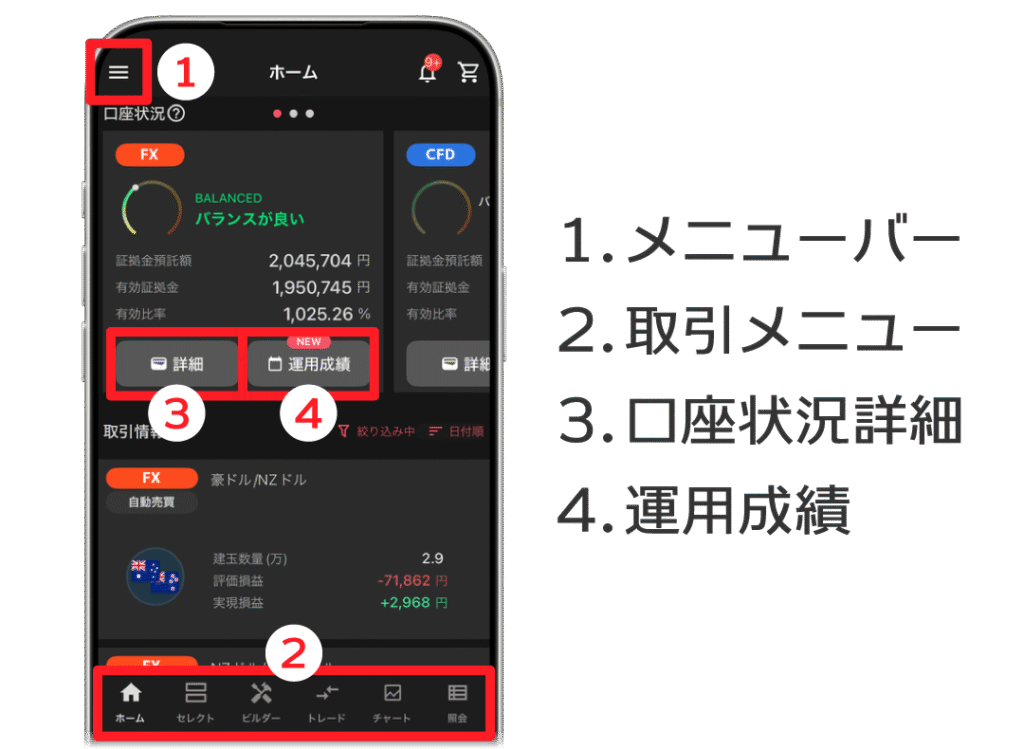 バランスメーター、証拠金(取引のために預けるお金)状況、通貨ペア(保有建玉・未約定注文)の比率を確認することもできます