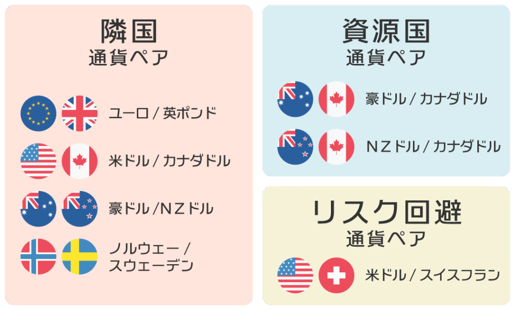 同じ地域で地理的に近く、経済的に相互依存している国同士は、どちらか一方の通貨が強くなりにくく、トレンドが出にくい特徴があります。資源国通貨同士や、リスク回避通貨同士といったペアも同様に、どちらかが一方的に流れを作ることが少ない傾向があります。