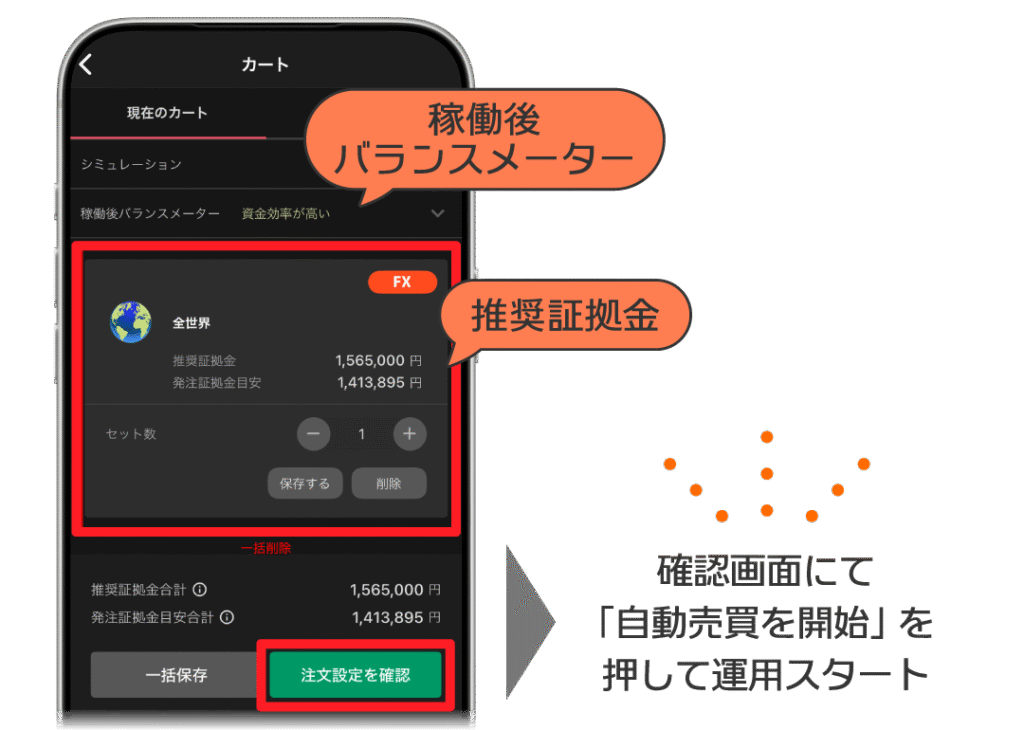 自動売買戦略をカートに追加したら確認画面に進み、「自動売買を開始」ボタンを押せば、そのまま運用を始められます。