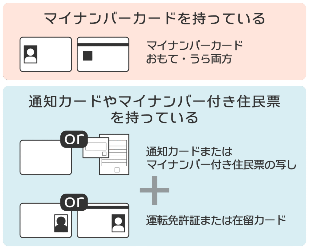 マイナンバーカードがない方は、「マイナンバー確認書類(通知カード、もしくはマイナンバー付の住民票の写し)」と「本人確認書類」を組み合わせて提出することで、口座開設することが可能です。