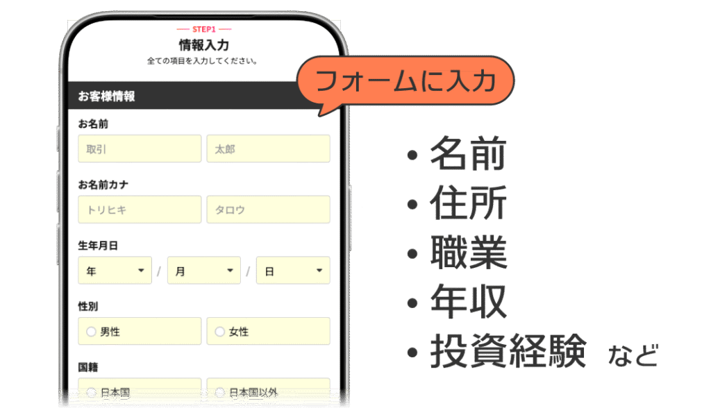 名前、住所、職業、年収、投資経験などを入力します。