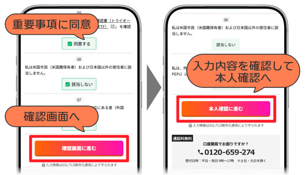 そこで食い違いが生じると本人確認書類の再アップロードを求められますので、正しく入力するよう気を付けましょう。一通りの情報を入力し、各種書面、重要事項に同意、確認画面で入力内容を確認します。