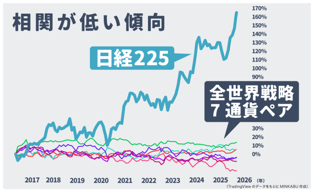 この特性は、株式や投資信託、さらには裁量トレードなど、性質の異なる投資と組み合わせることで、さらに活かせます。