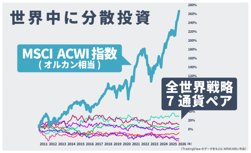 特に「オルカン(全世界株式インデックスファンド)」などは、世界中の企業に分散投資しているため、特定の銘柄や地域に依存しにくく、リスクを抑える効果があります。