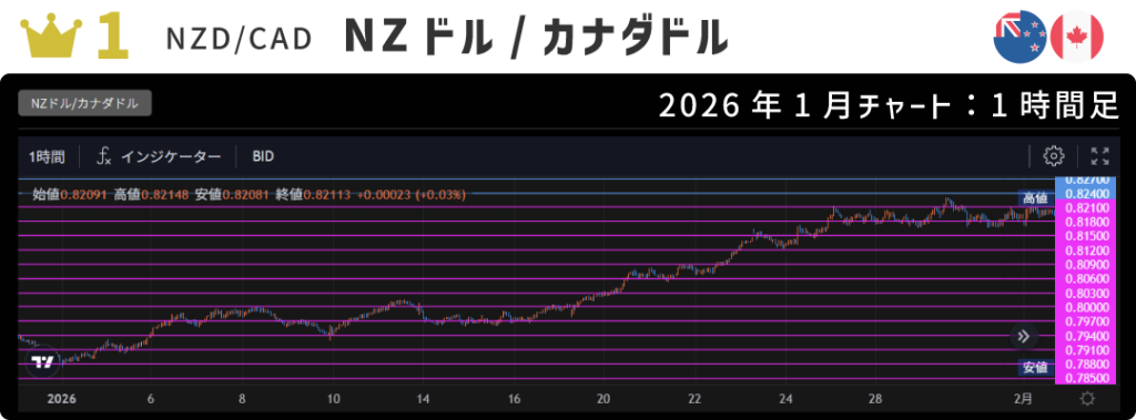 1月のNZドル/カナダドルは概ね0.785~0.823(380pips)内で推移。途中もみ合いもありましたが、概ね上昇トレンドで推移しました。
