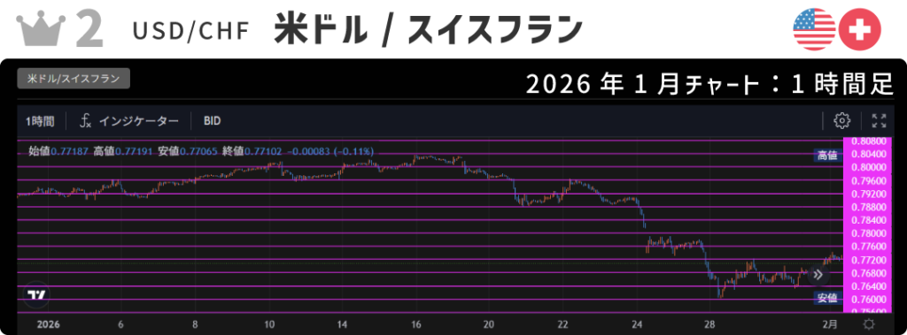 2位は米ドル/スイスフラン。2025年は米ドル通貨の弱さもあり、ランキング下位に位置する事が多かったですが2026年はいきなりの上位獲得となりました。