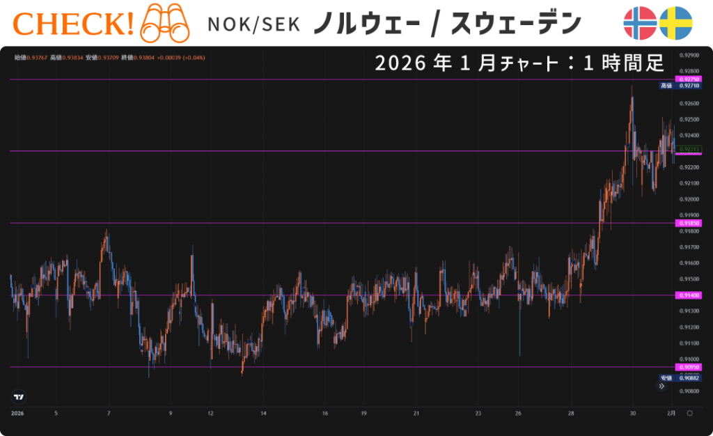一方、ノルウェー中銀も追加利下げの可能性を残しつつも1月は政策金利4.0%の維持を発表しています。両国の金利差でスワップも狙いつつ上昇トレンドを期待する戦略は引き続き効果的です。