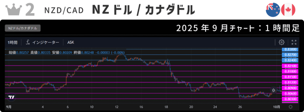 NZドル/カナダドルはカナダ中銀が政策金利引き下げ、NZ中銀が金利維持はAUD/CADと同じものの、9月18日NZ4-6月期GDP(国内総生産)が前期比マイナス0.9と大きく予想を下回る結果となり、10月の政策金利引き下げが意識されたことで下落しました。