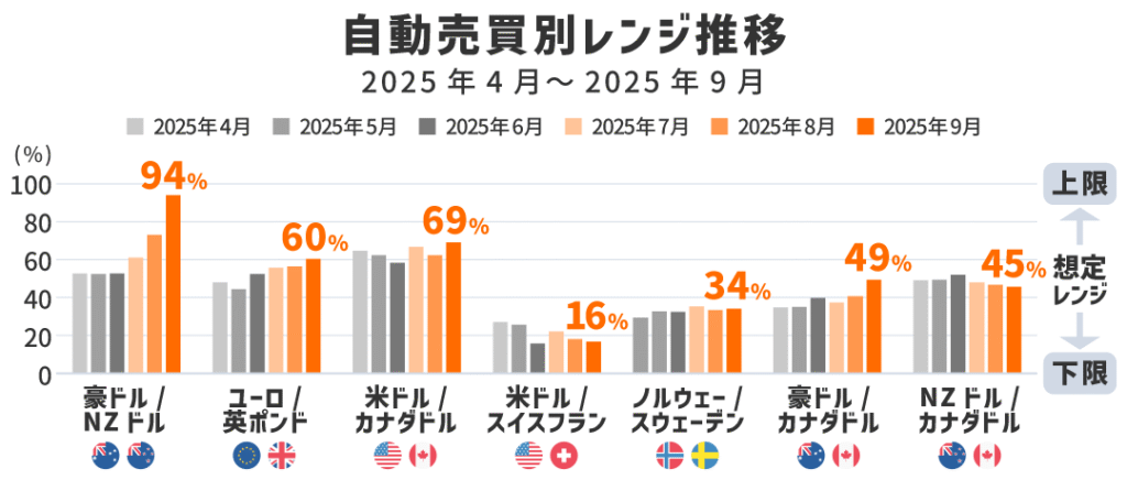 先ほど解説した豪ドル/カナダドル、NZドル/カナダドルは9月末時点でそれぞれ49%、45%と中間付近にいる一方で豪ドル/NZドルは94%と上限に近づいています。